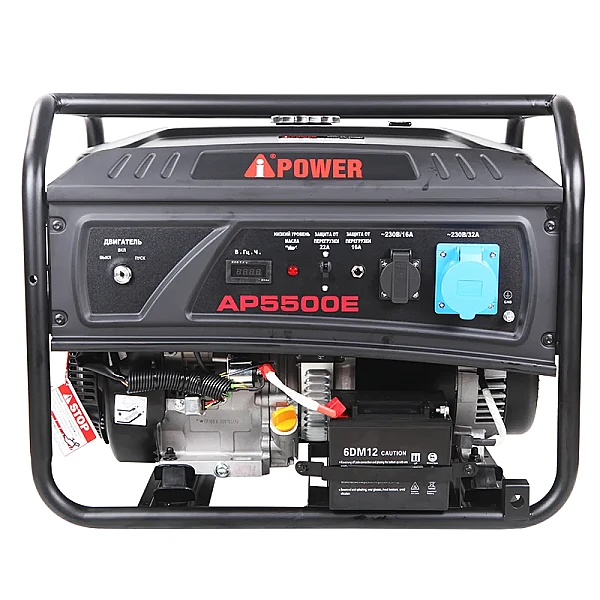 На передней панели мини бензогенератора A-iPower Lite AP5500E расположена евророзетка 230В/16А и силовой выход на 32А, который дает возможность направить полную мощность установки на одного потребителя. Обе закрыты подпружиненными крышками, что гарантирует безопасность при работе в плохую погоду.