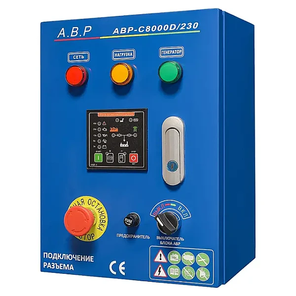 Блок АВР для дизельного генератора от 5 до 8 кВт/230 включает в себя систему автозапуска (автоматического ввода резервного электропитания). При появлении основного источника электропитания происходит отключение электростанции. Блок автоматического управления для контроля наличия напряжения в сети.