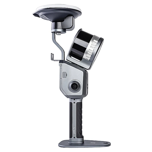 Для определения пространственного положения окружающих объектов, SLAM-сканер оборудован 16-канальным LiDAR-модулем с дальностью действия до 120 м. Он способен выполнять сканирование со скоростью 320 000 точек/с, вращаясь одновременно в двух плоскостях, обеспечивая сектор обзора 360° x 270°. Сбор визуальных данных для расцвечивания получаемого облака точек выполняют правая и левая 48-мегапиксельные панорамные камеры.