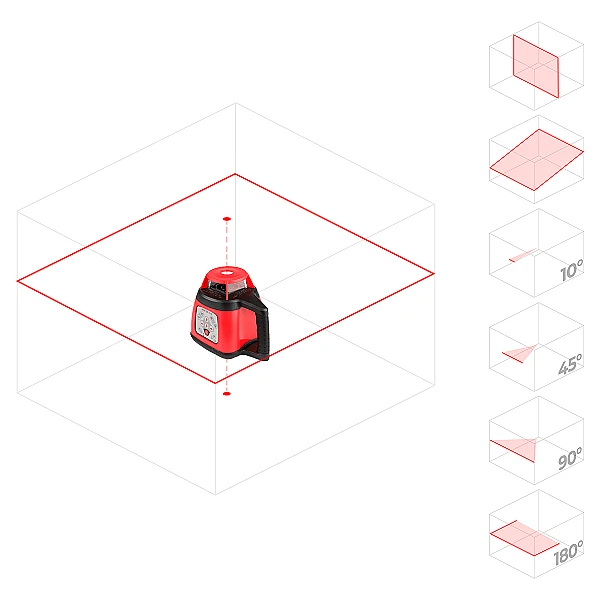 Прочный и герметичный корпус прибора обеспечивает его сохранность при работах в самых различных погодных условиях. Скорость вращения нивелира может быть задана пользователем, и составляет 300 или 600 оборотов в минуту. Питание лазерного уровня осуществляется за счёт блока аккумуляторов, одна зарядка которых обеспечивает бесперебойную работу прибора в течение 24 часов.